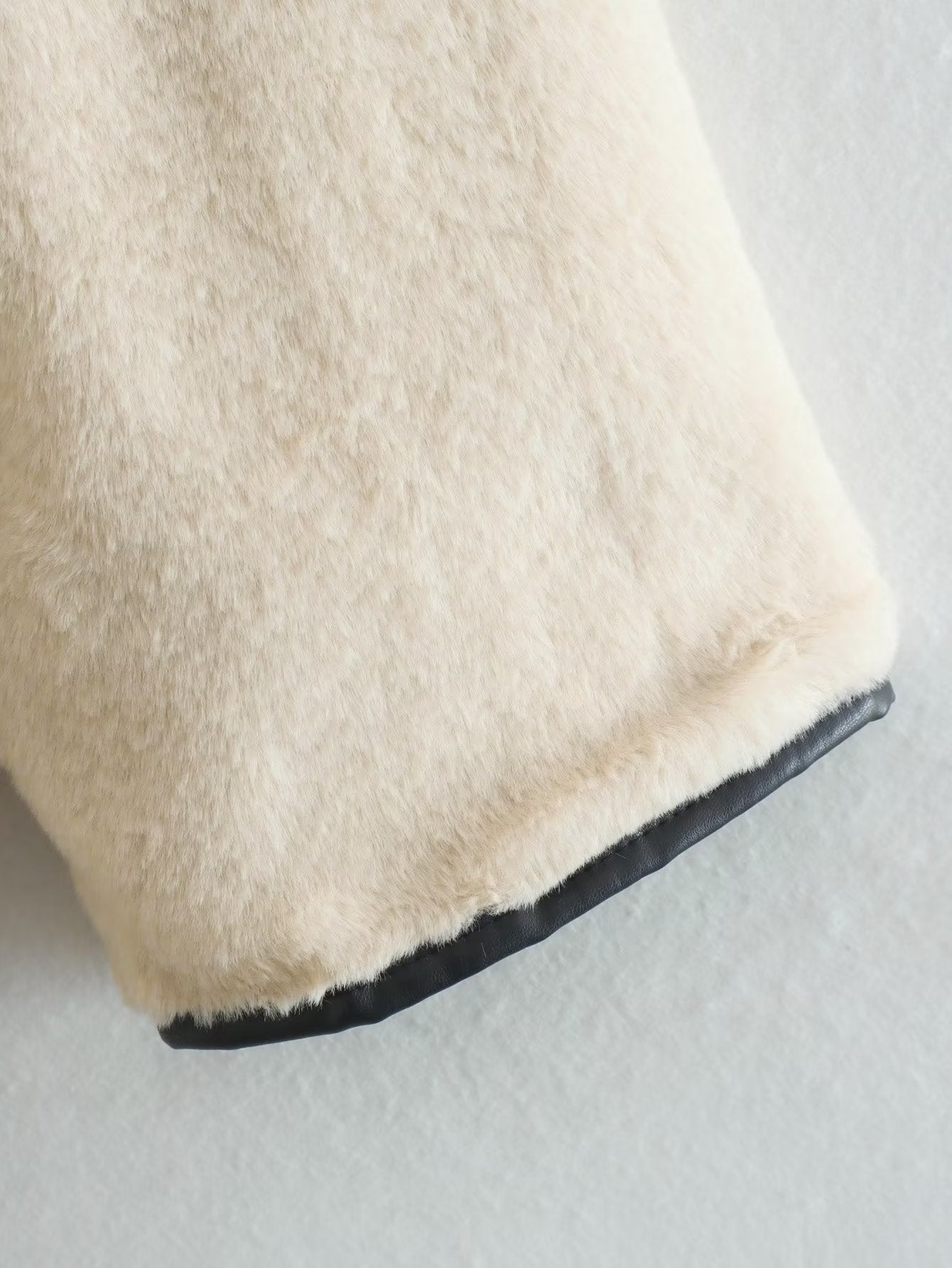 Crafted from premium imitation leather with a soft, fur-like texture, this piece exudes understated sophistication while offering warmth and comfort. The round neckline frames the silhouette with subtle elegance, complemented by chic button detailing that adds a touch of refinement. Its relaxed, loose fit ensures effortless comfort, making it perfect for both daily wear and professional settings. Designed in a creamy-white hue, this jacket embodies MRHVII’s signature balance of modern simplicity and timeless style.